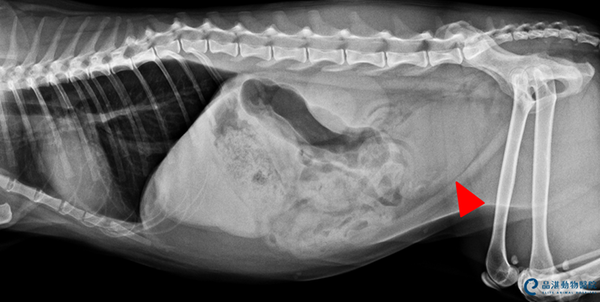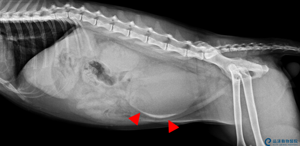 Fig 1 經X光檢查可發現膀胱有許多小細砂(紅色箭頭指示白色亮點處),導致尿道阻塞,無法排尿。